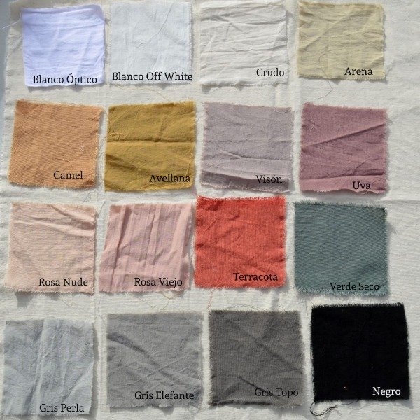 Los colores de los almohadones lisos: Blanco optico, blanco off white, crudo, arena, camel, rosa viejo, rosa nude, avellana, mostaza, verde seco, terracota, visón, uva, gris perla, gris elefante, gris topo, negro.